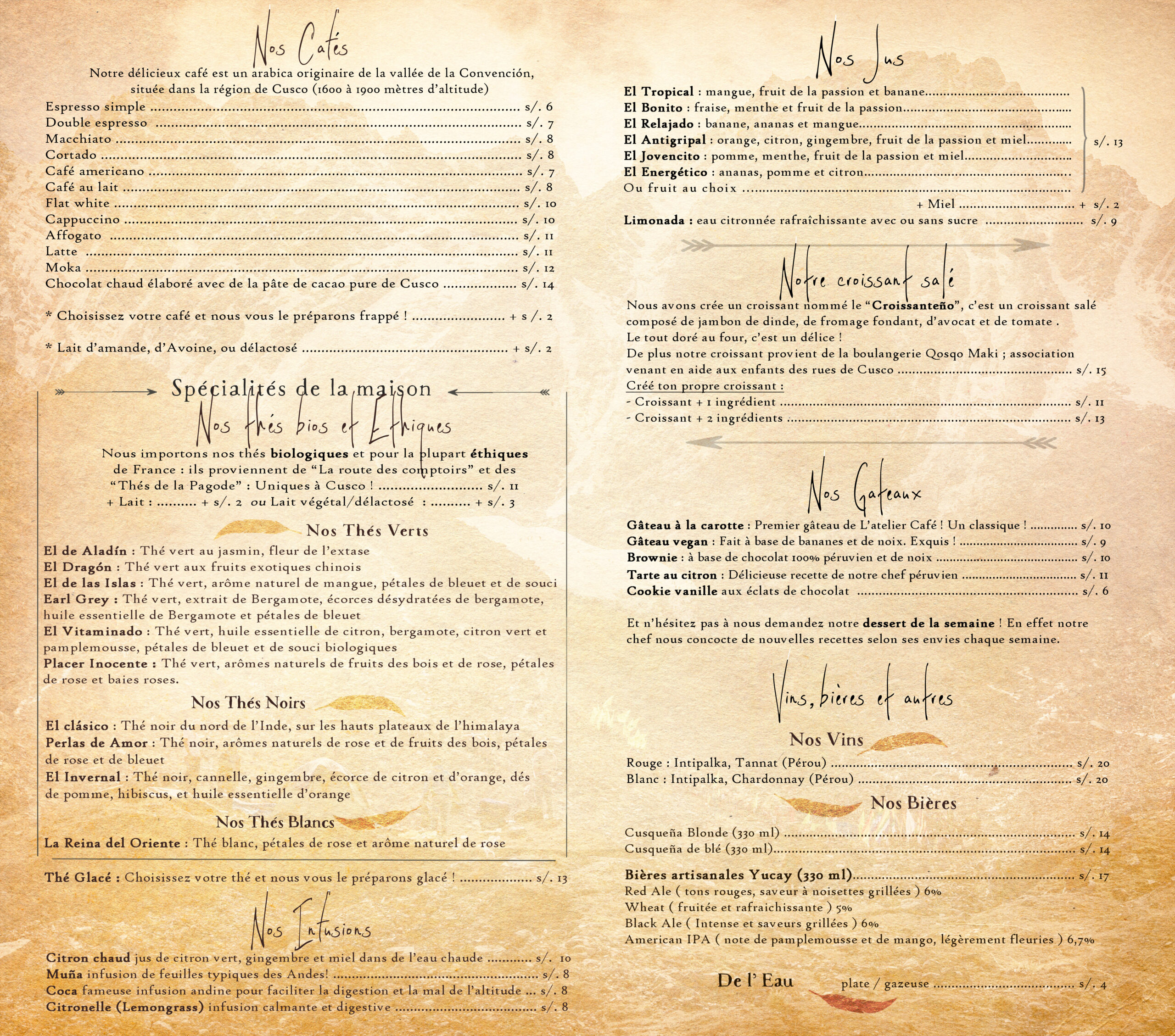 Nous préparons toutes vos boissons sur place et artisanalement. Nos recettes de gâteaux ont été peaufinées par notre chef pâtissier péruvien mêlant goût, textures, savoir-faire et cultures…
