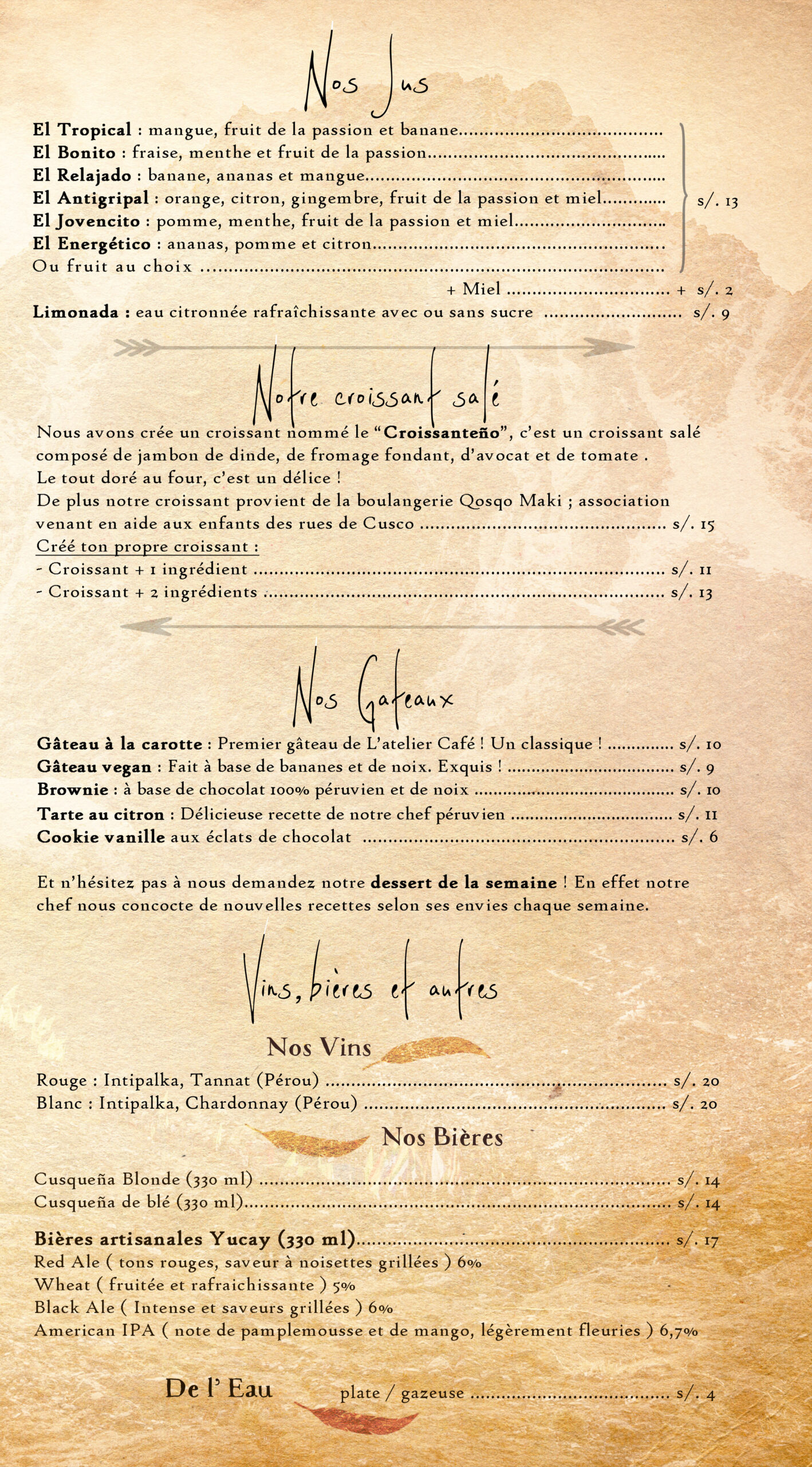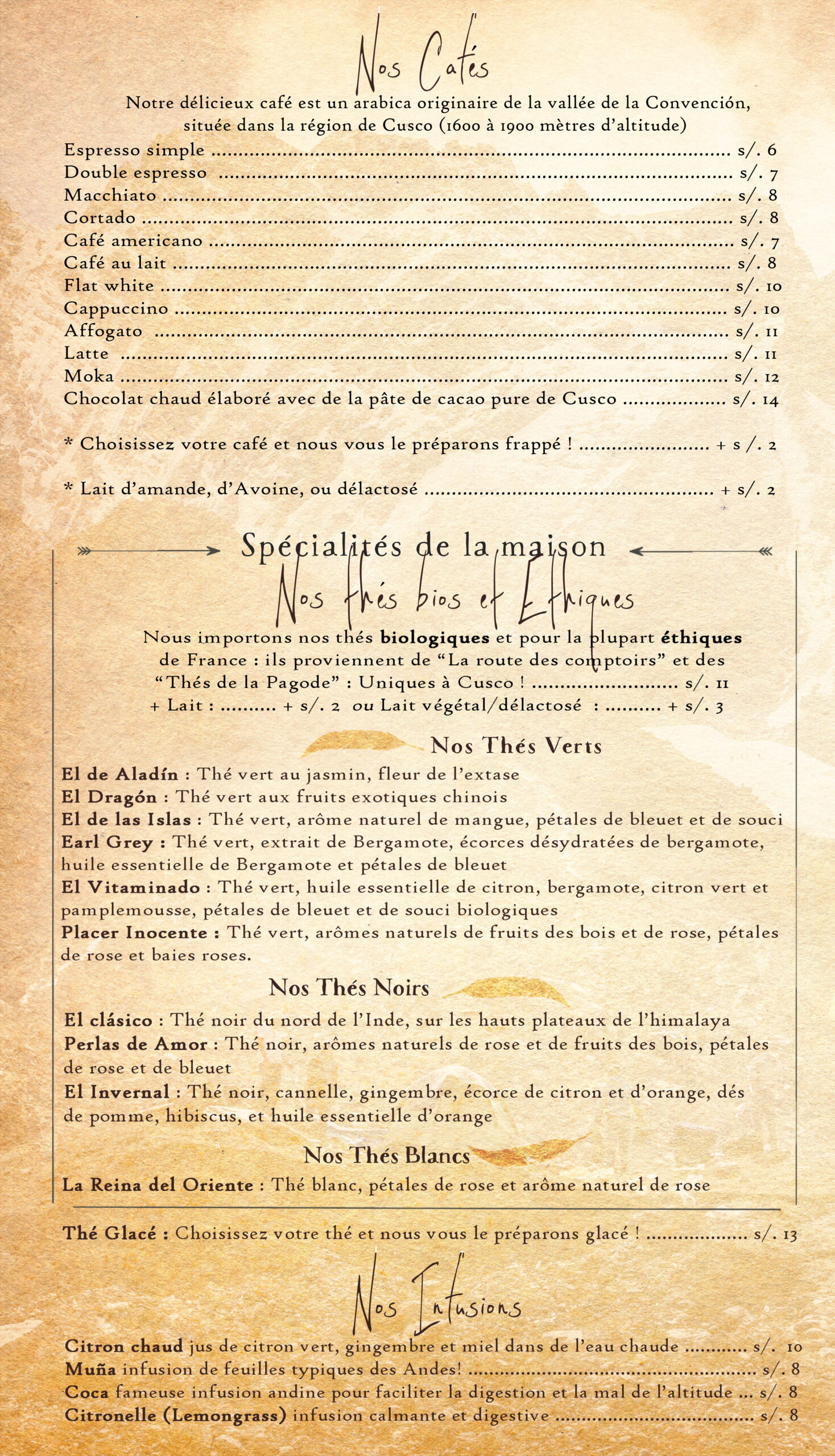 Nous préparons toutes vos boissons sur place et artisanalement. Nos recettes de gâteaux ont été peaufinées par notre chef pâtissier péruvien mêlant goût, textures, savoir-faire et cultures…